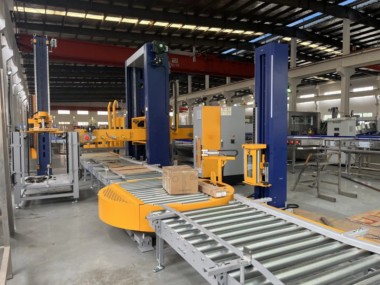 This is a complete 12000BPH 500ml PET bottle carbonated production line, including water treatment system, pretreatment system, rotary blowing system, filling system (flowmeter filling), carbonation system, labeling system (sleeve labeling, OPP labeling and flat labeling), film wrapping system and palletizing system.