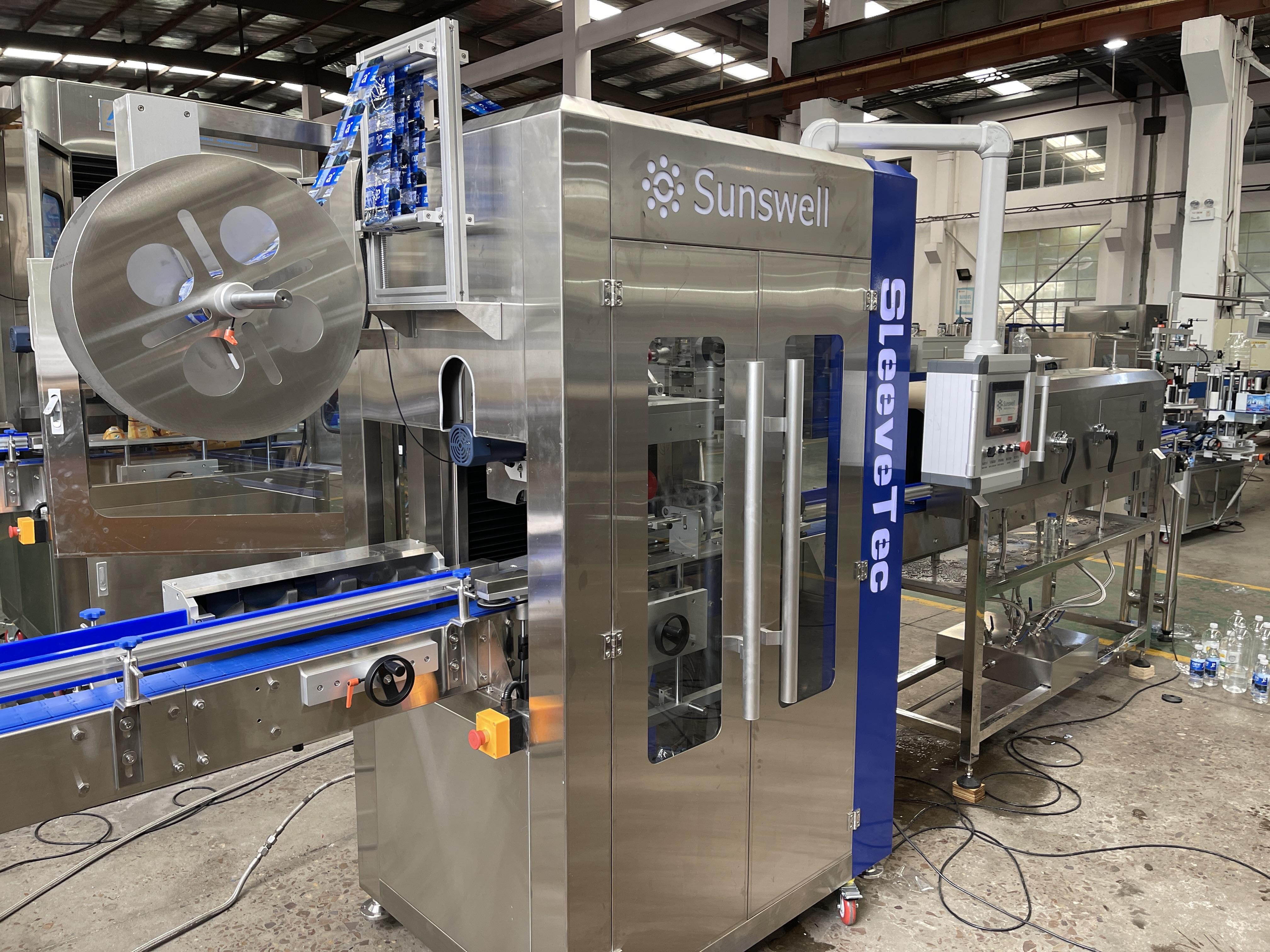 Aquanissi ever purchased a 7000BPH water filling line including 3-in-1 filling machine, automatic film shrink wrapper from Sunswell to replace their old linear filler. In the past six years, the efficient operation of Sunswell bottling line has greatly improved the efficiency of customer production line. However, the disadvantage of this production line is that manual sleeve labeling is used, and the entire line cannot achieve satisfactory efficiency. Undoubtedly, the customer found Sunswell again to purchase a fully automatic sleeve labeling machine to help them realize the complete automation of the production line.