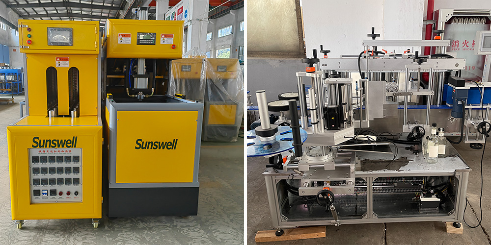 The whole order package includes a 2000BPH bottling line and the PET bottle blow molding machine. The bottling line is mainly composed of rinser, filler, capper, labeling machine, and bottle covneyors, etc. The PET blow molder will equip auxiliary equipment as air compressors and chillers.
