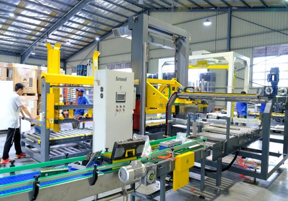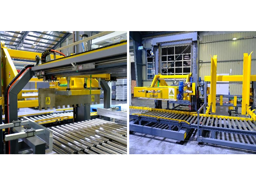 Sunswell palletizer is used in the industries of water, beverage, beer, liquid food, edible oil and daily care products, etc. to stack various types of bottles and cans, with a small occupied area, easy adjustment and large production capacity, it is particularly suitable for a film wrapped packs and cartons.