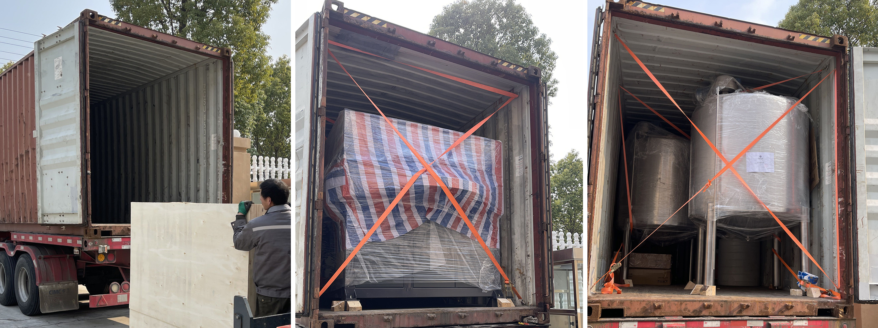 The two containers were fully loaded with a complete 3000BPH*500ml) pure water and flavor water bottling line, including fully automatic blow molding machine, air conveyor, RO water treatment system,3-in-1 filling machine , liquid nitrogen dosing machine, filled bottle conveyor, labeling machine, laser marker for code, automatic film shrink wrapper and auxiliary equipment as air compressors, chiller, etc.