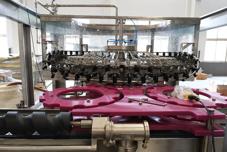 It’s composed by filling tank, filling valve, control cam, elevated cylinder, and clock cover valve opener and up and down dispenser. When it’s tested there is bottle, the valve opener opens the control pole and then CO2 opens. When the bottle pressure set the same pressure as tank interior, the main liquid passage opens automatically. The main liquid exhaust CO2, while it returns to the needle whole and air exhaust pipe. When the continuous liquid seal the air pipe, the bottle pressure is higher than the tank pressure. Under the pressure effect, the filling valve stops. After the filling finish, shut up the filling valve and let the CO2 out through the exhaust cam. (Don’t exhaust too fast, otherwise easy to get foam.