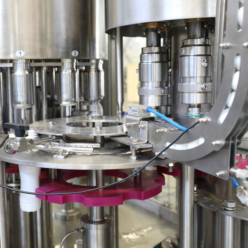 *After the filling is completed, the filling valve is turned off; the filled bottle passes through the transition wheel in the wheel assembly, and is sent to the capping machine of the three-in-one machine , the anti-rotation knife on the capping machine clamps the bottle neck, keeps the bottle upright and prevents rotation.