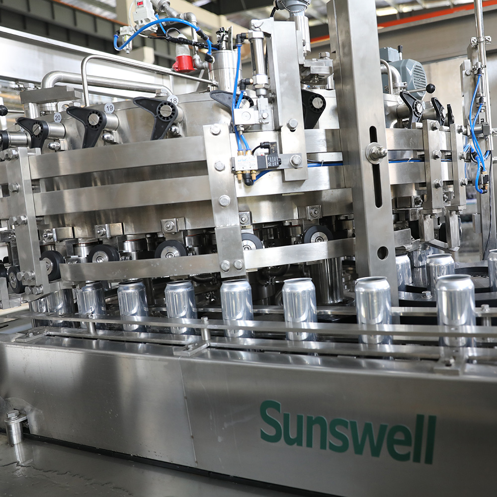The working principle of this machine is as follows. First, the washed empty cans enter the filling cylinder through the infeed screw and star wheel. After pressed and sealed under the centrifugal cover, the cans are rinsed with CO2, and start filling after the cans are left for a while to stand still. The filling is performed in rapid filling and slow filling in turn. After finishing filling, stand still for a while and then perform slow and fast discharging in turn. The centrifugal cover lifts after exhausting completely, then the finished cans discharge from filling cylinder and enter the conveyor belt. The cans enter the sealing machine by foam purge driven by chain fork. The capping head of the sealing machine rotates and keeps the revolution. The capping head presses the can with the lid and rotates. Turn over the edge of can and turn the edge to finish the sealing action by the control of cam. The sealed cans are transferred to conveyor system through the discharge star wheel.