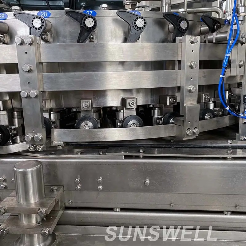 The lid rod pushes the can away from the capping head, and at the same time, the tank star wheel pushes the sealed cans out of the can sealer and puts the cans onto the conveyor belt of the can table.