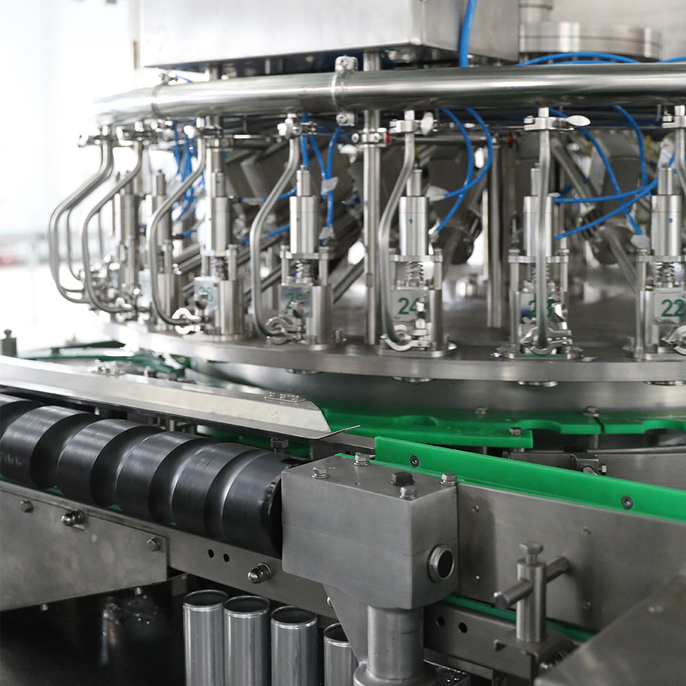 Cans will be pushed into can holding platform one by one by feeding screw and star-wheel. Centering cup of filling valve will fall to can; the distance between filling valves and cans is sealed by springiness plastic ring. The movement of centering cup is generated by plastic idler wheel along curvilinear motion. After filled, valve will be closed and centering cup will rise from the can. Filled can will be sent to conveyor chain, then to seamer. Seamer will take lid, turn over the edge of can and turn the edge to finish the sealing action by the control of cam. After that can will be transferred to conveying system.