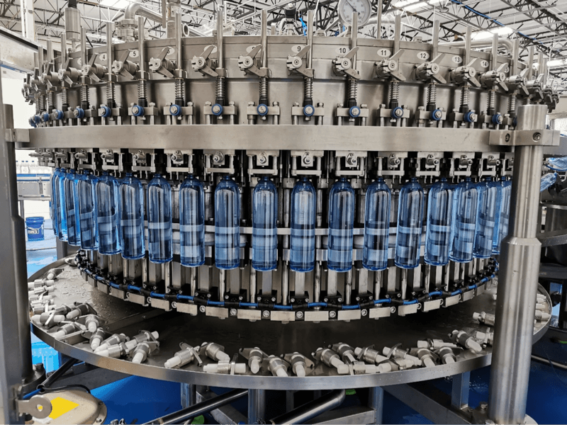 3-in-1 combiblock, composed of blowing, CSD gravity filling and capping. It is innovated and designed in the requirement of carbonated soft drinks and carbonated water. The combiblock avoids friction of bottles during air conveying.