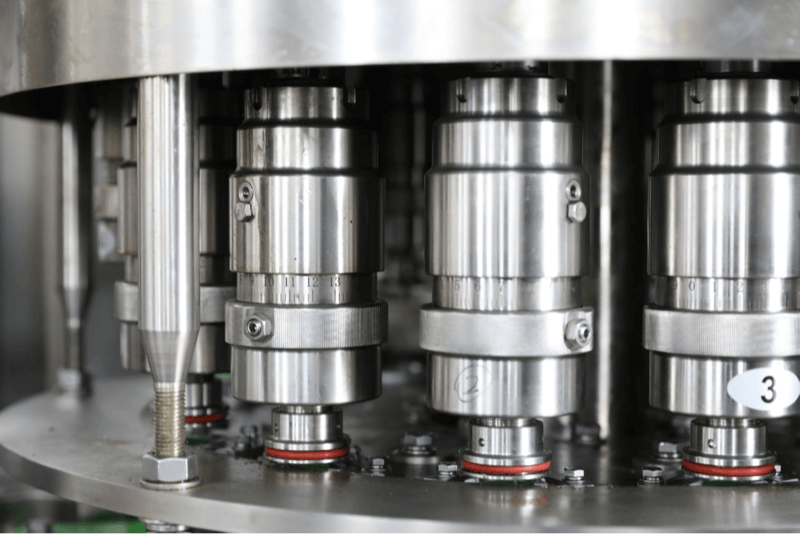 ♦ Bottles go up and down by pneumatic cylinders and cams, to process filling with contact to bottle-mouth.