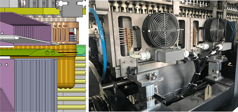 ♦ Using streamlined guide plate, so that the air flow more effectively on the preform neck cooling and protection